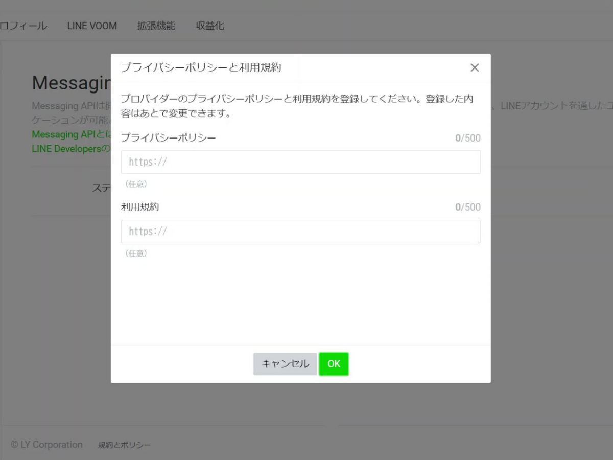 - 作成したプロバイダーに、プライバシーポリシーと利用規約を設定する場合は入力します。設定しない場合は「OK」をクリックします。