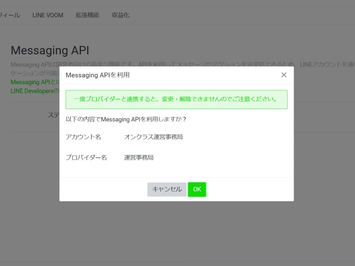 - Messaging APIを利用するLINE公式アカウントと、設定したプロバイダー名に間違いがないことを確認し、「OK」をクリックします。