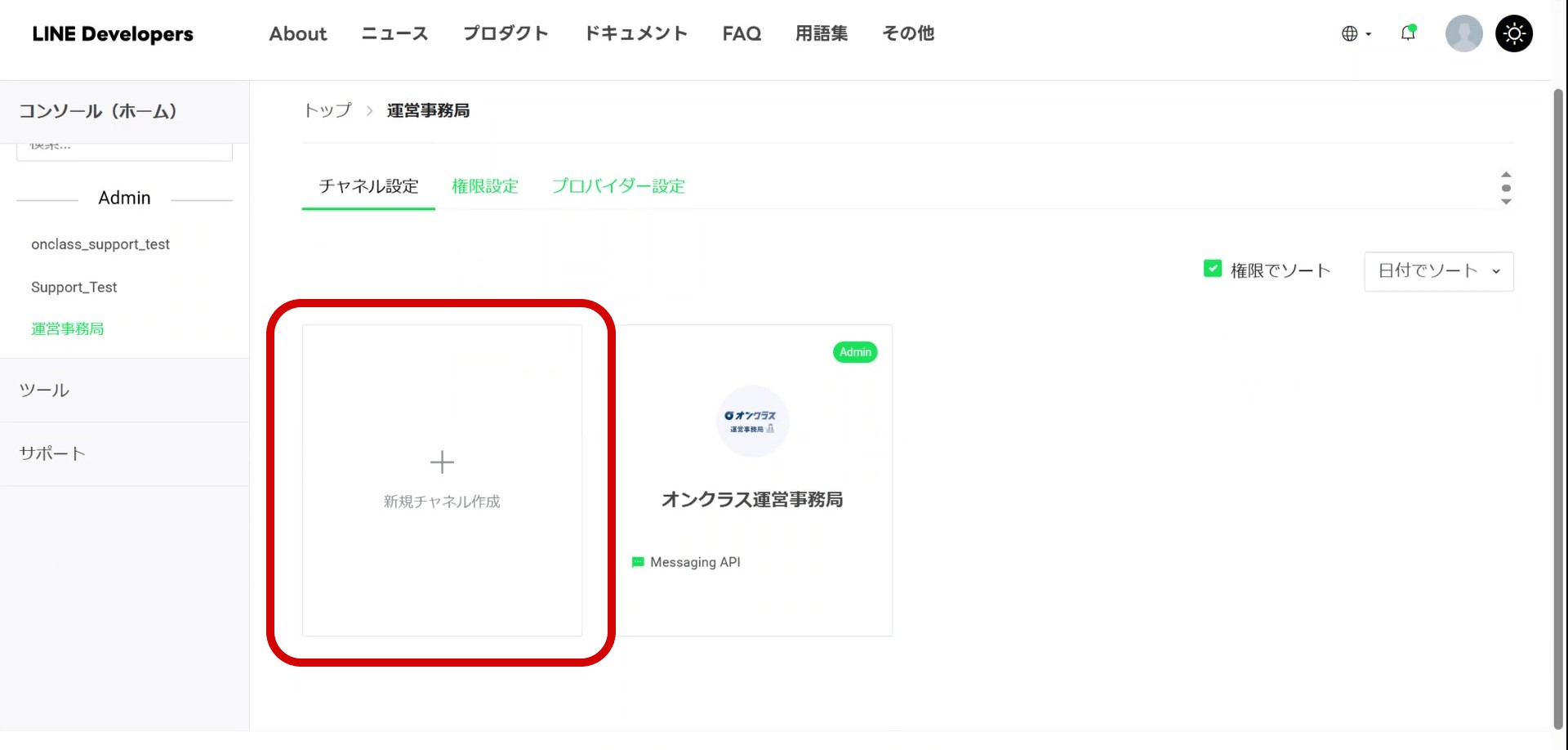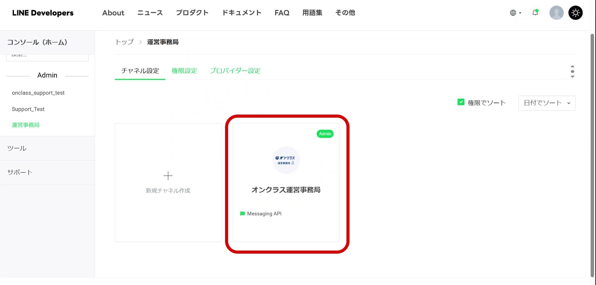 - 表示された画面の左側にあるプロバイダーの一覧から、ステップ1でMessaging APIを設定したときに作成・選択したプロバイダー名をクリックします。