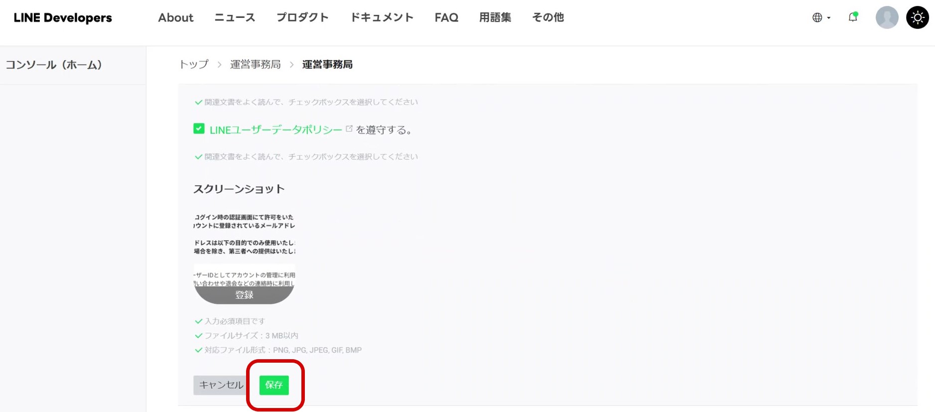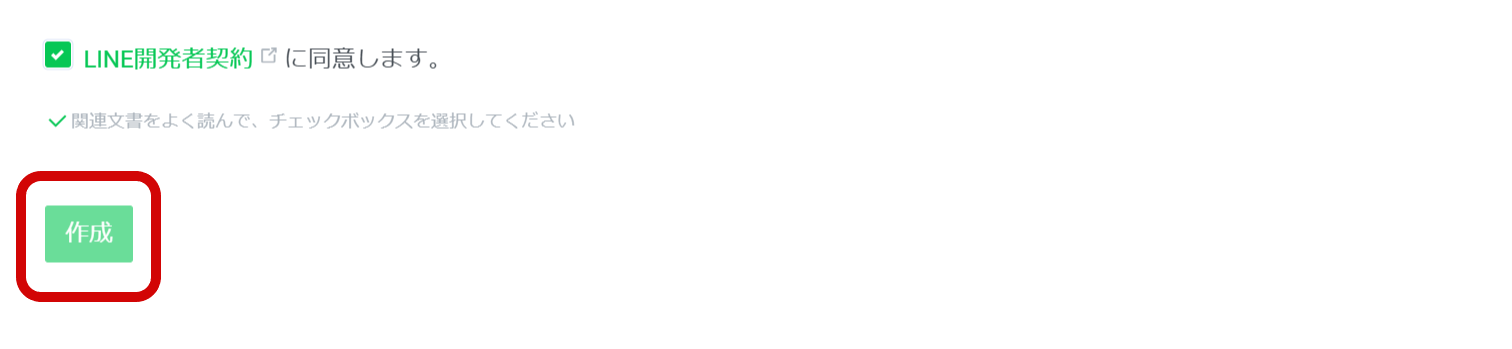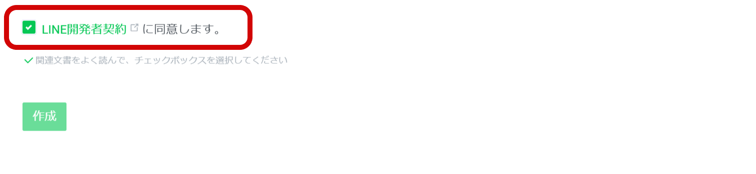 - LINE開発者契約の内容を確認の上、「LINE開発者契約に同意します」にチェックを入れます。