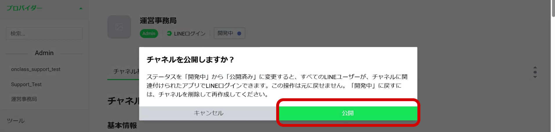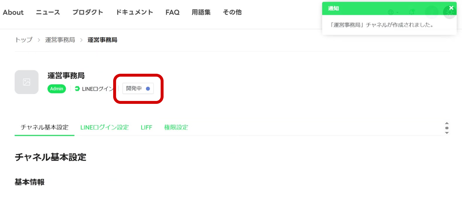 - 表示された画面のチャネル名の下にある「開発中」をクリックします。