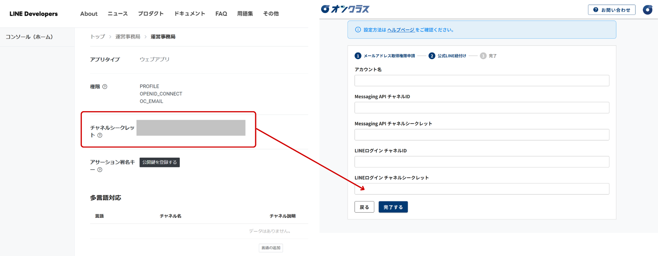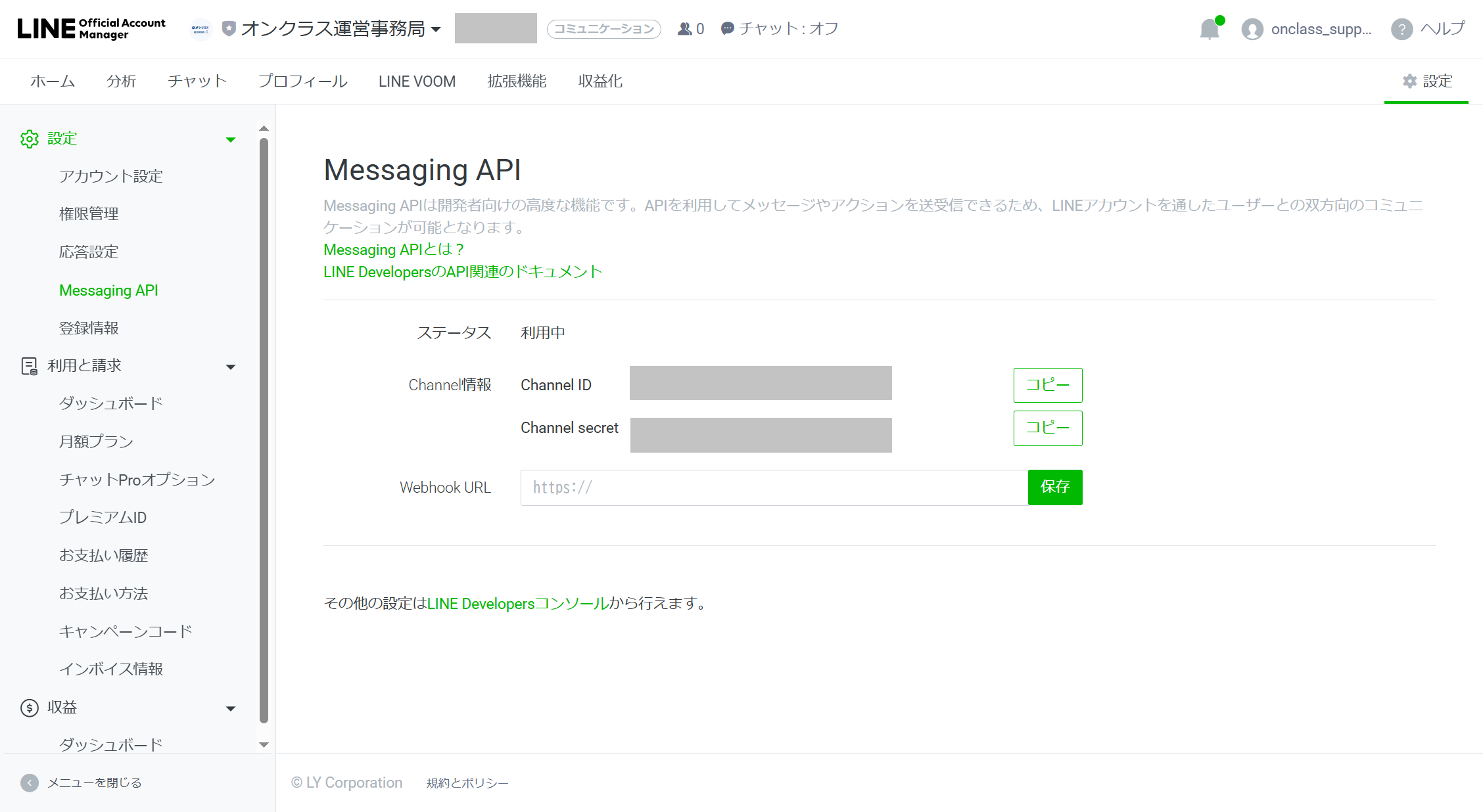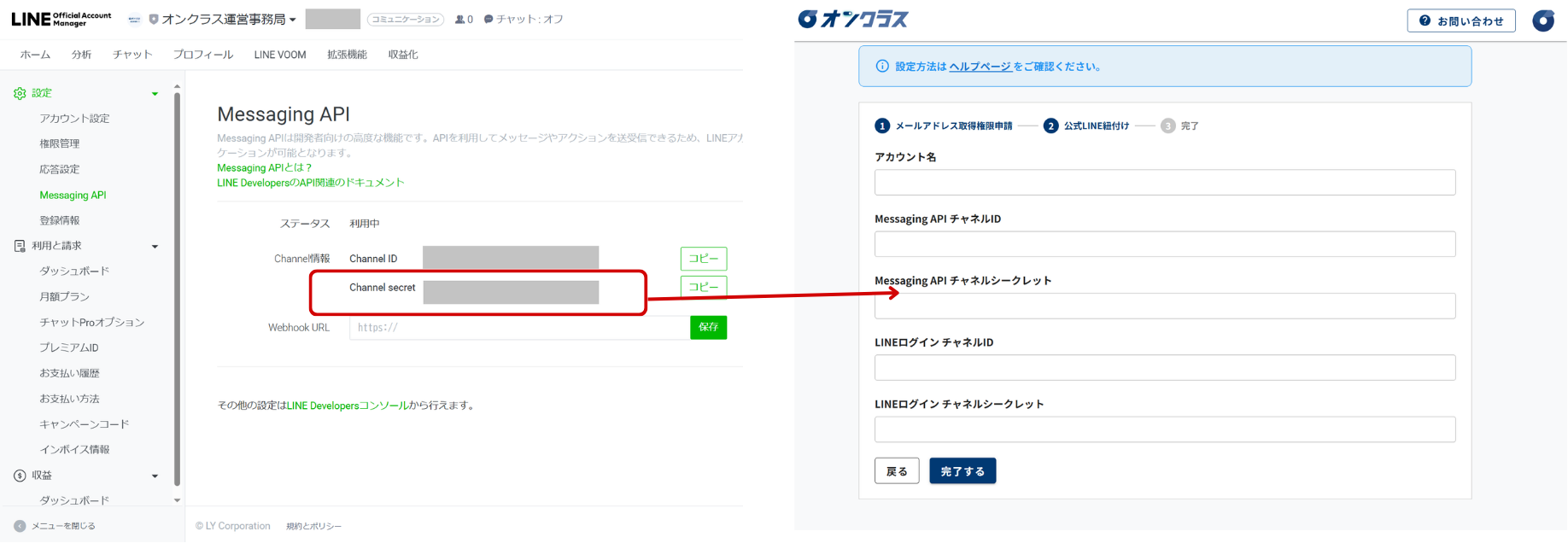 - Messaging APIの画面に戻り、「Channel Secret」をコピーした後、オンクラスの管理画面を再度表示し、「Messaging API チャネルシークレット」の欄へ貼り付けます。