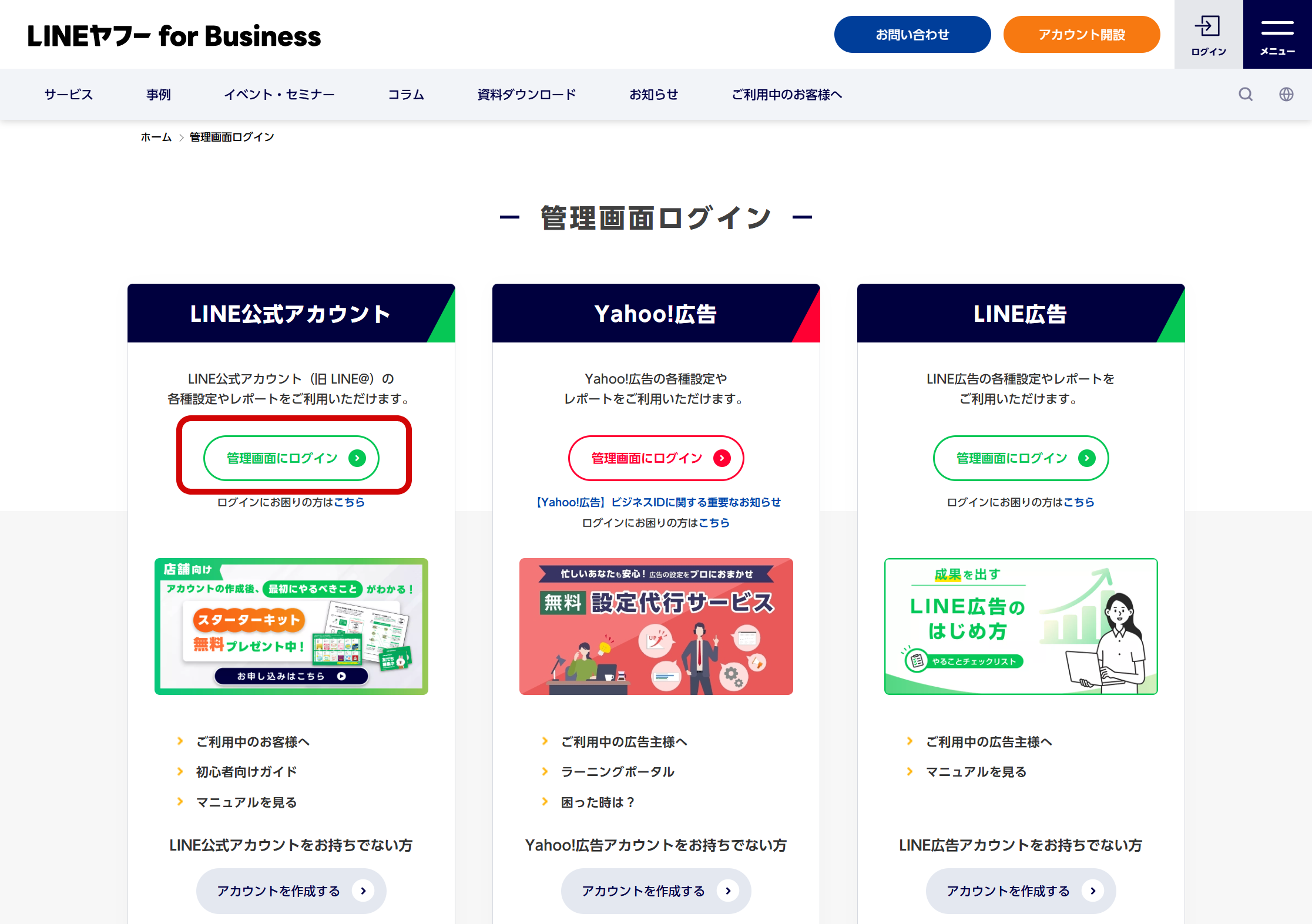 ※上記ページを開いた後、LINE公式アカウントの欄にある、「管理画面にログイン」をクリックして、LINE Official Account Managerにログインしてください。