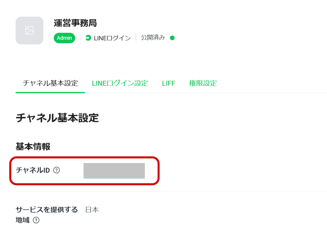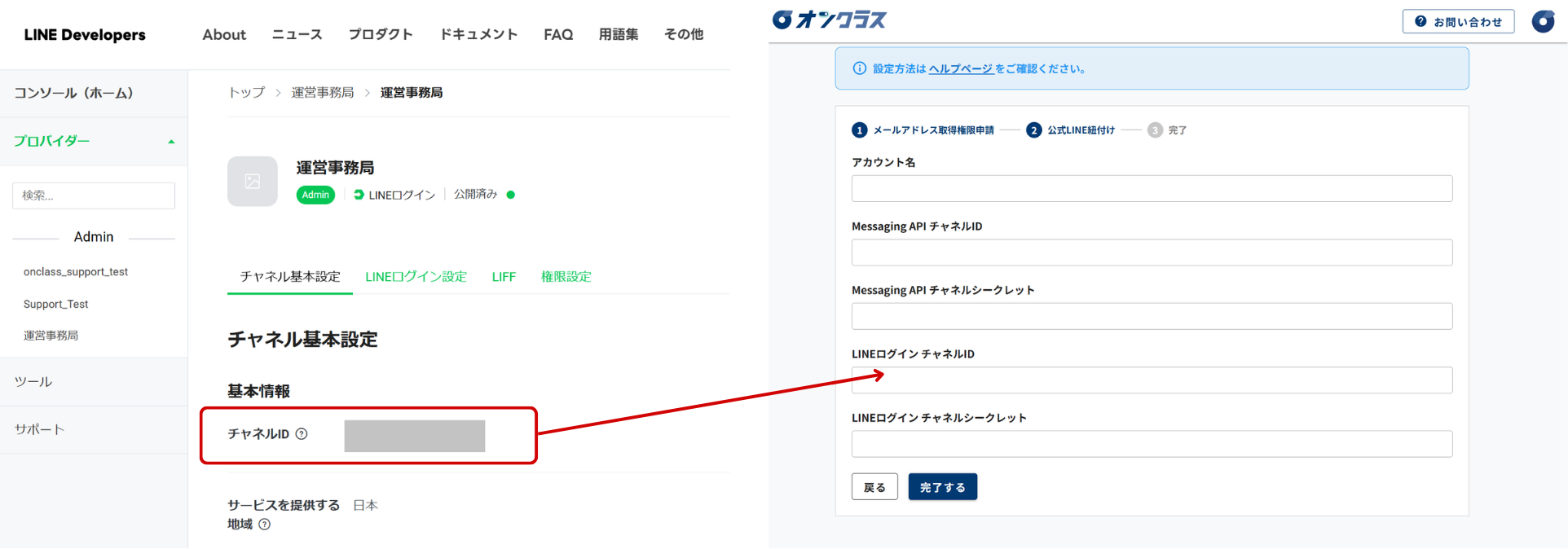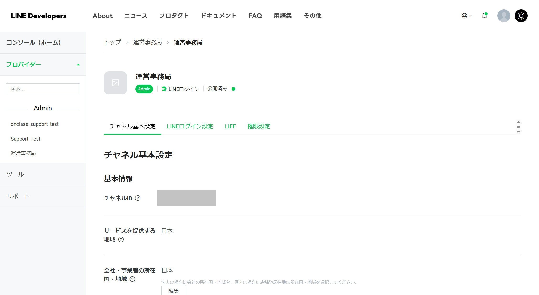 - LINEログインチャネルの「チャネル基本設定」に表示されている、「チャネルID」をコピーした後、オンクラスの管理画面を再度表示し、「LINEログイン チャネルID」の欄へ貼り付けます。