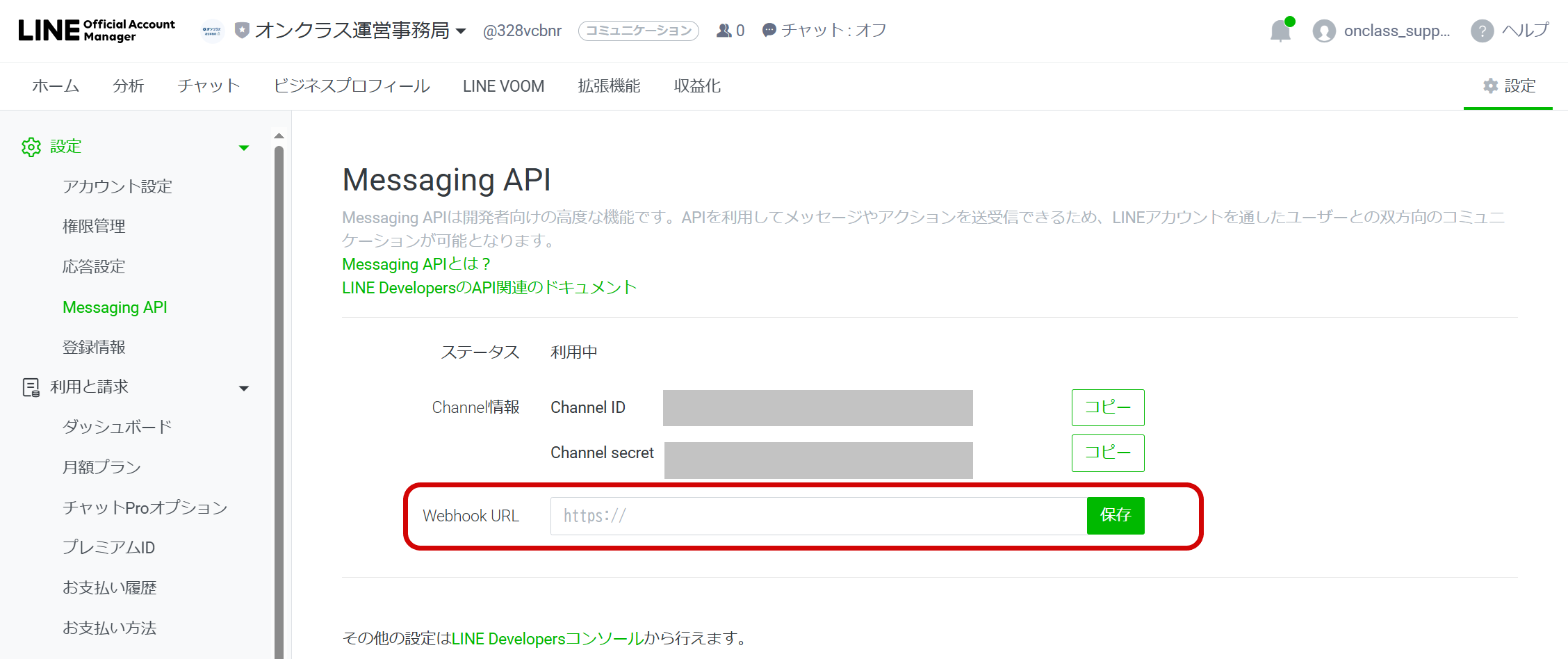 - 「LINE Official Account Manager」の画面を再度表示し、Webhook URLの欄へオンクラスの管理画面でコピーしたWebhook URLを貼り付けます。