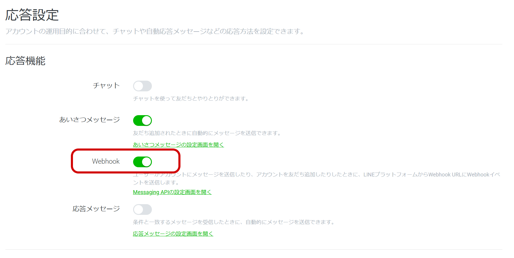 ※左側のアカウント設定メニューが表示されていない場合は、「LINE Official Account Managerのアカウント設定メニューが表示されていない場合」のページを参照して表示してください。 - 「Webhook」のトグルボタンを「オン」に設定します。