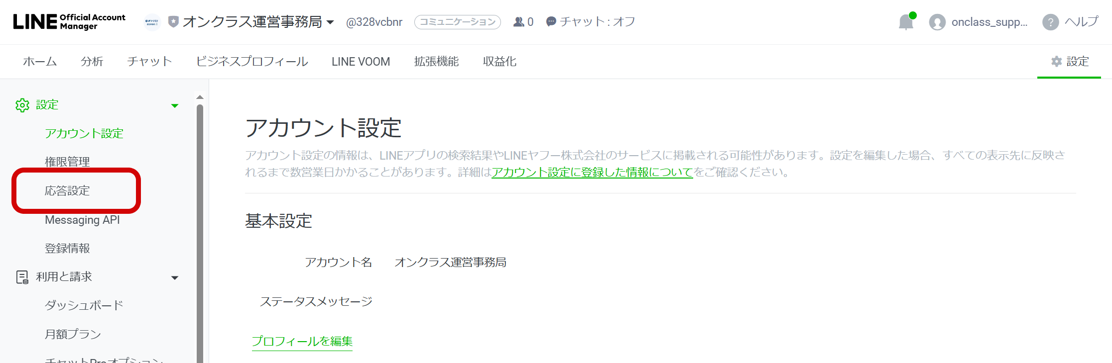 - ページ左側のアカウント設定メニュー※から、「応答設定」をクリックします。