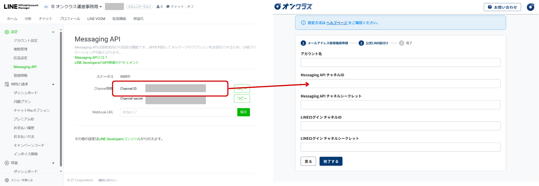 - Messaging APIの画面に表示されている、「Channel ID」をコピーした後、オンクラスの管理画面を再度表示し、「Messaging API チャネルID」の欄へ貼り付けます。
