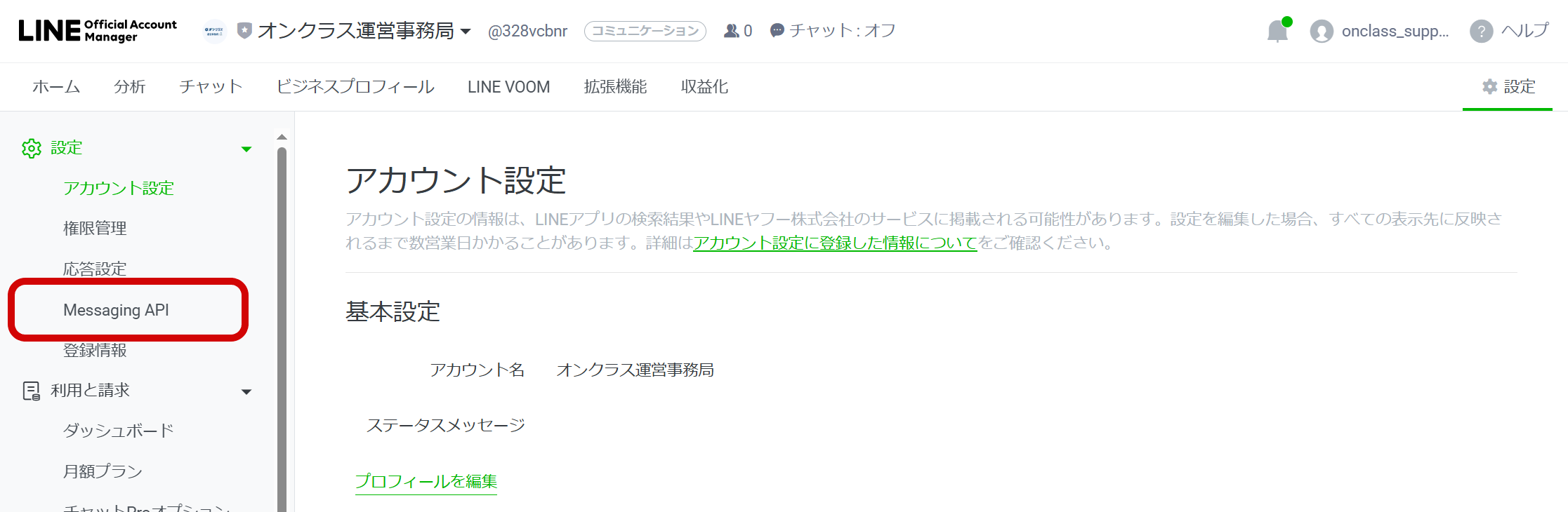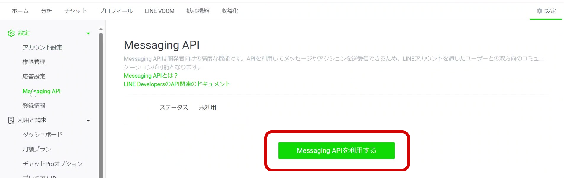 - ページの左側に表示された設定メニューから、「Messaging API」をクリックします。