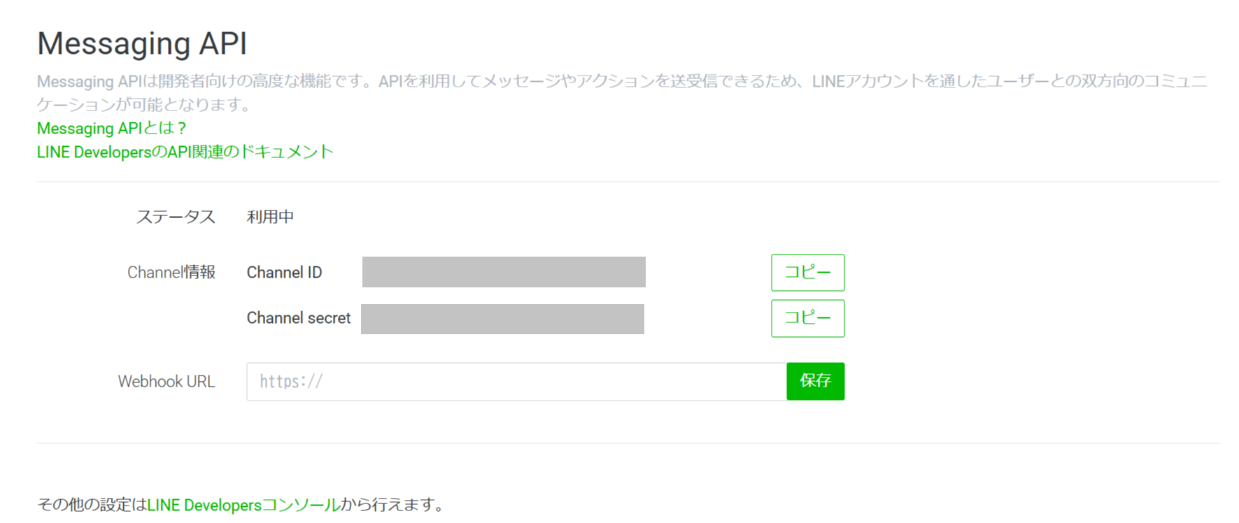 ※Messaging APIのChannel IDとChannel Secretが表示されている場合は、既にMessaging APIの設定済みの状態です。「Messaging APIを利用する」ボタンが表示されない場合のページを確認してください。
