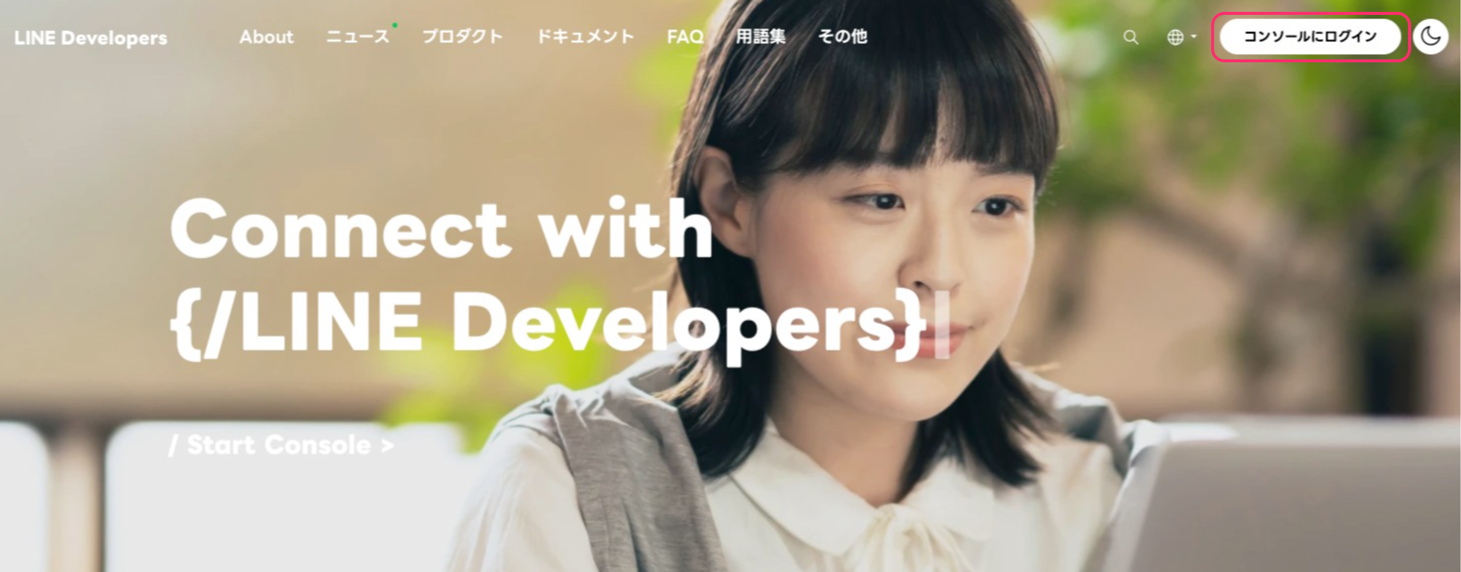 - LINE Developersへアクセスし、画面右上にある「コンソールにログイン」をクリックします。