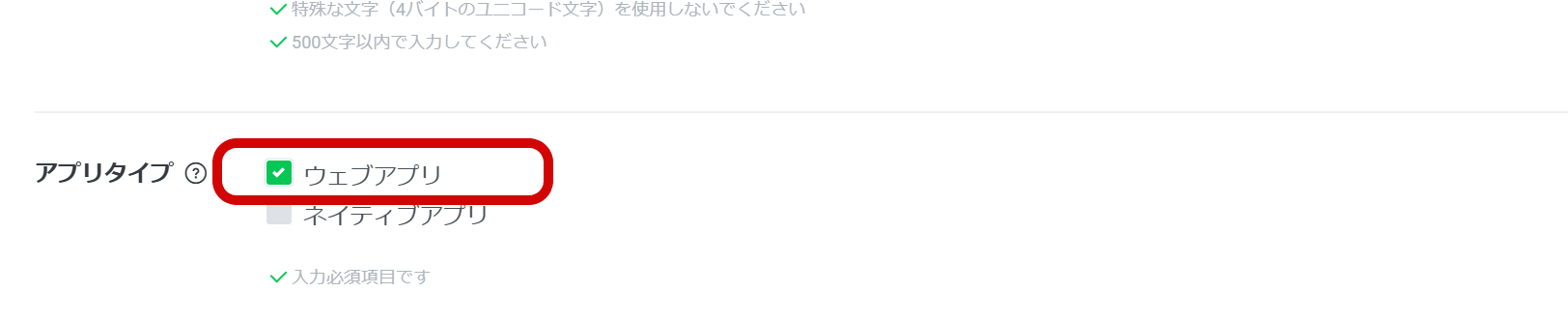 - アプリタイプの欄で、「ウェブアプリ」にチェックを入れます。