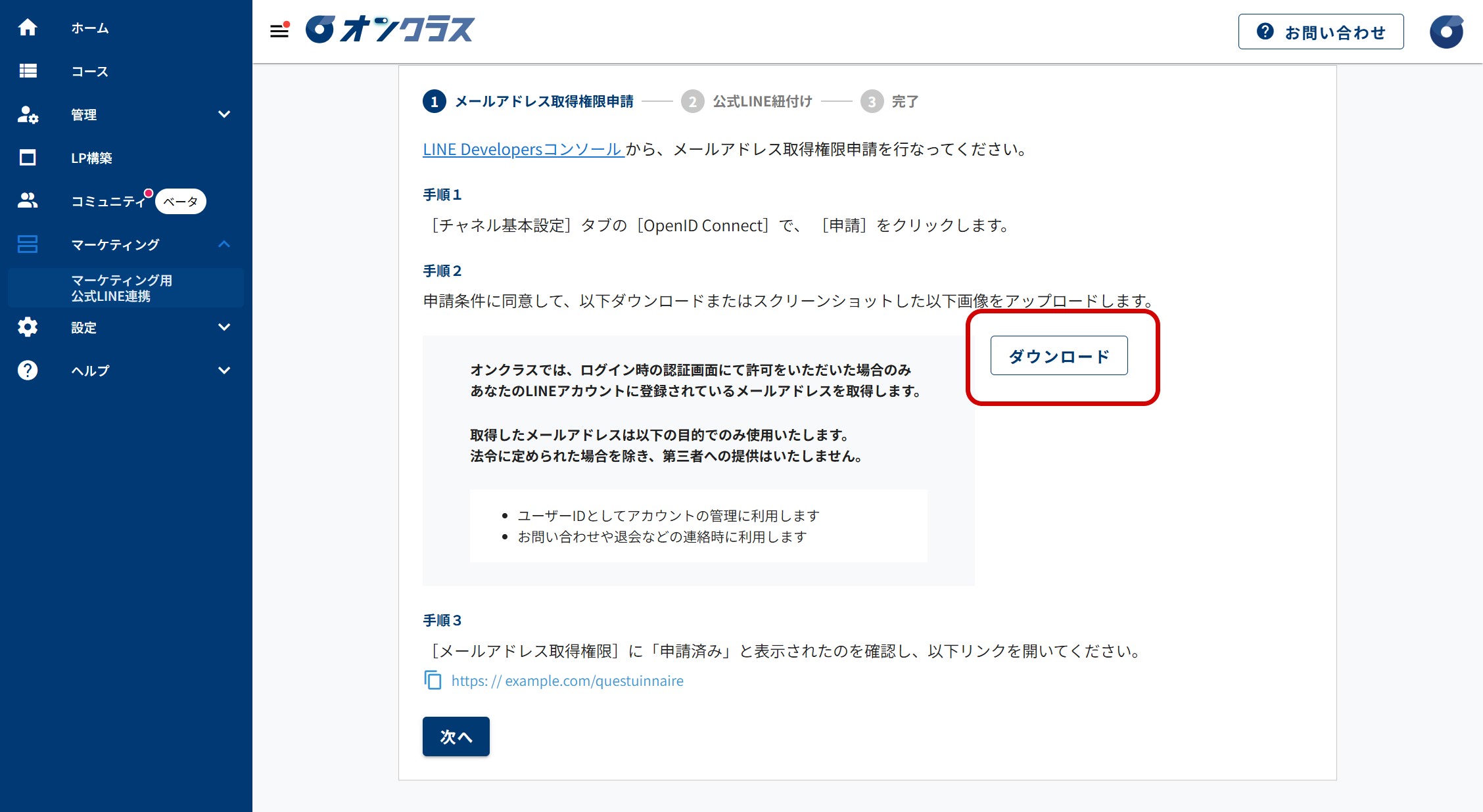 - オンクラスの管理画面を再度表示し、LINE Developersコンソールアップロード用の画像を取得します。「ダウンロード」をクリックして画像を保存するか、スクリーンショットを撮影します。