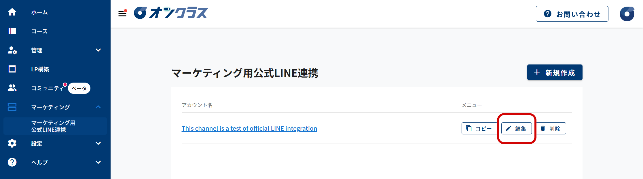 - オンクラスの管理画面を再度表示し、マーケティング用公式LINE連携にあるアカウントの「編集」をクリックします。