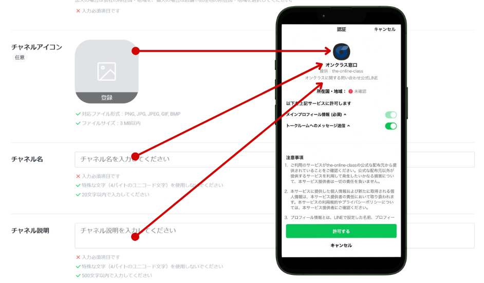 ・チャネル名、チャネル説明、チャネルアイコンは、ユーザーがお友だち追加するときに表示される認証画面に表示されます。名称や情報は、公式アカウントに設定している内容と合わせることで、ユーザーがサービス提供者を判断しやすくなります。