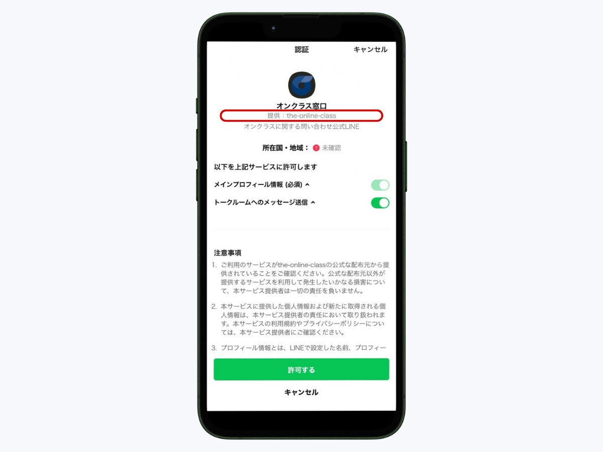 ・プロバイダー名は、ユーザーがお友だち追加するときに表示される認証画面の、チャネル名のすぐ下に表示されます。ユーザーがサービス提供者を判断できるよう、企業名や団体名など適切な情報を設定いただくことを推奨します。