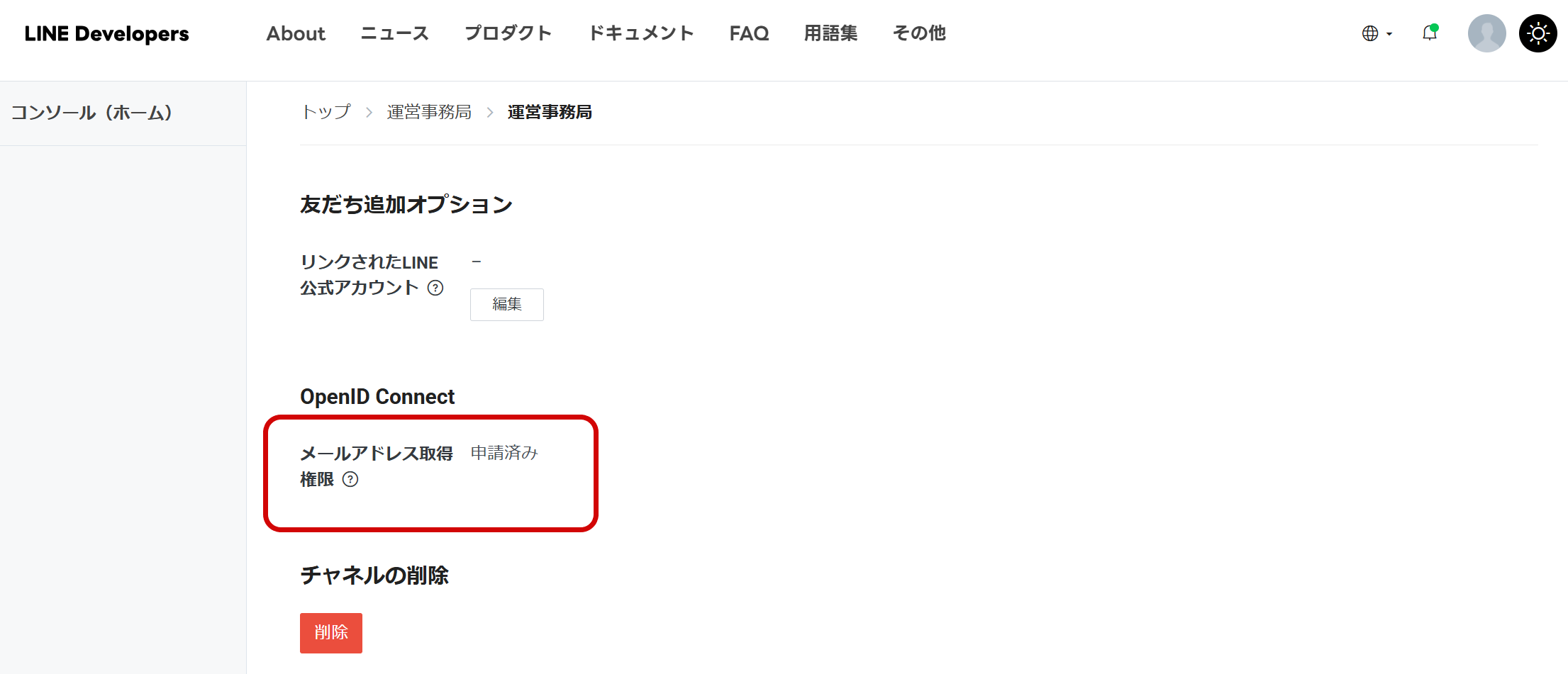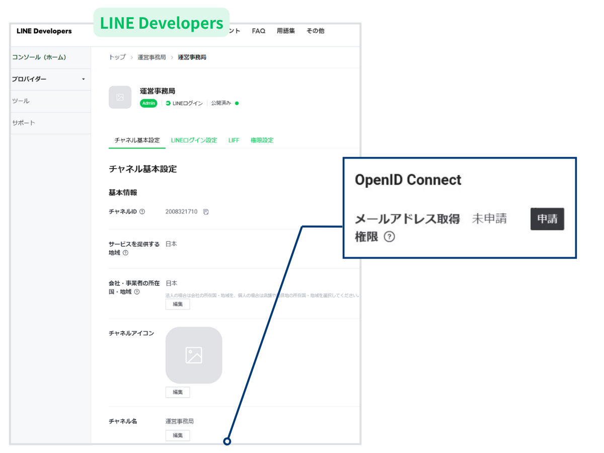 - ステップ2で開いたLINE Developersコンソールの画面を再度表示し、LINEログインチャネル チャネル基本設定の最下部にある、「OpenID Connect」という項目にある「申請」をクリックします。