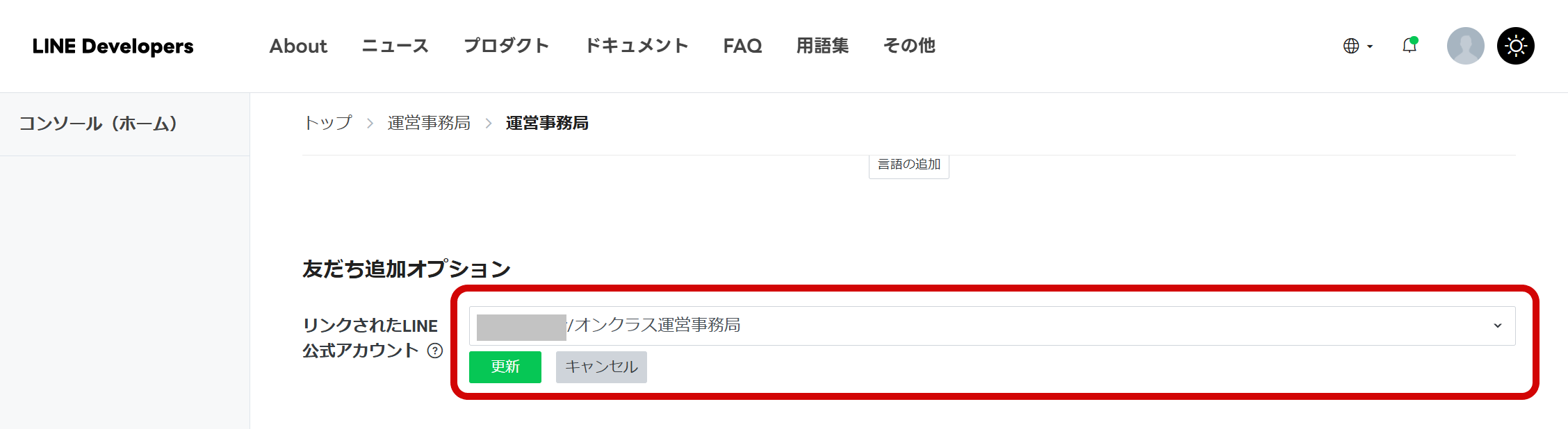 - オンクラスと連携させるLINE公式アカウントを選択し、「更新」をクリックします。