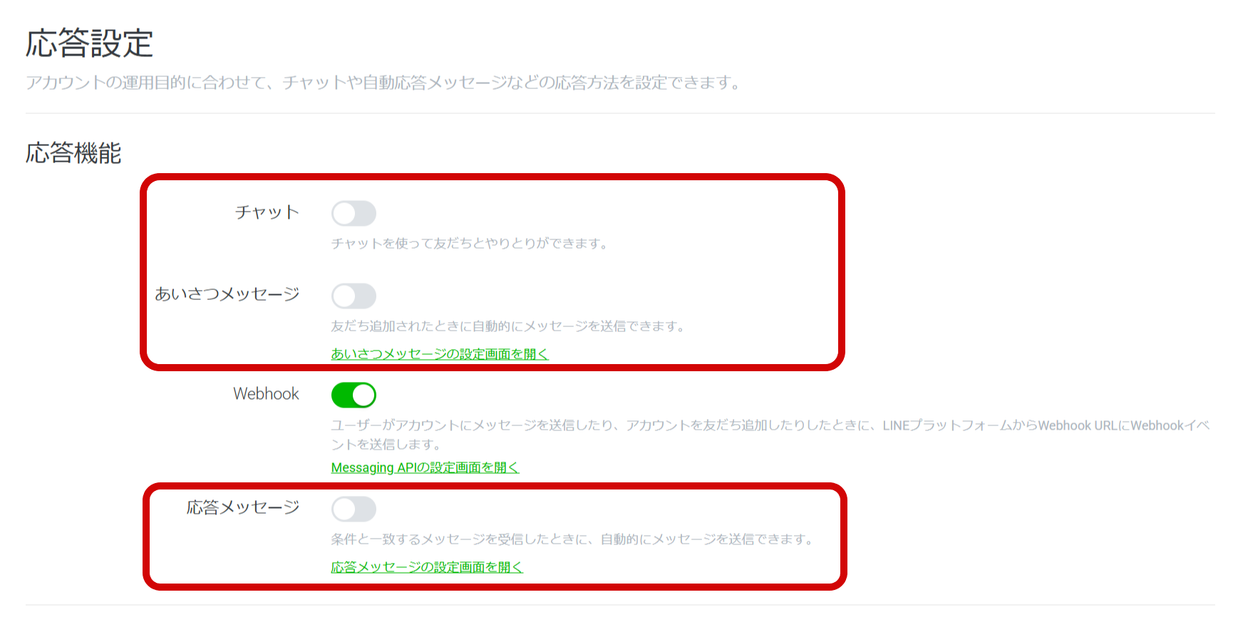 - チャット、あいさつメッセージ、応答メッセージのトグルボタンをすべて「オフ」に設定します。
