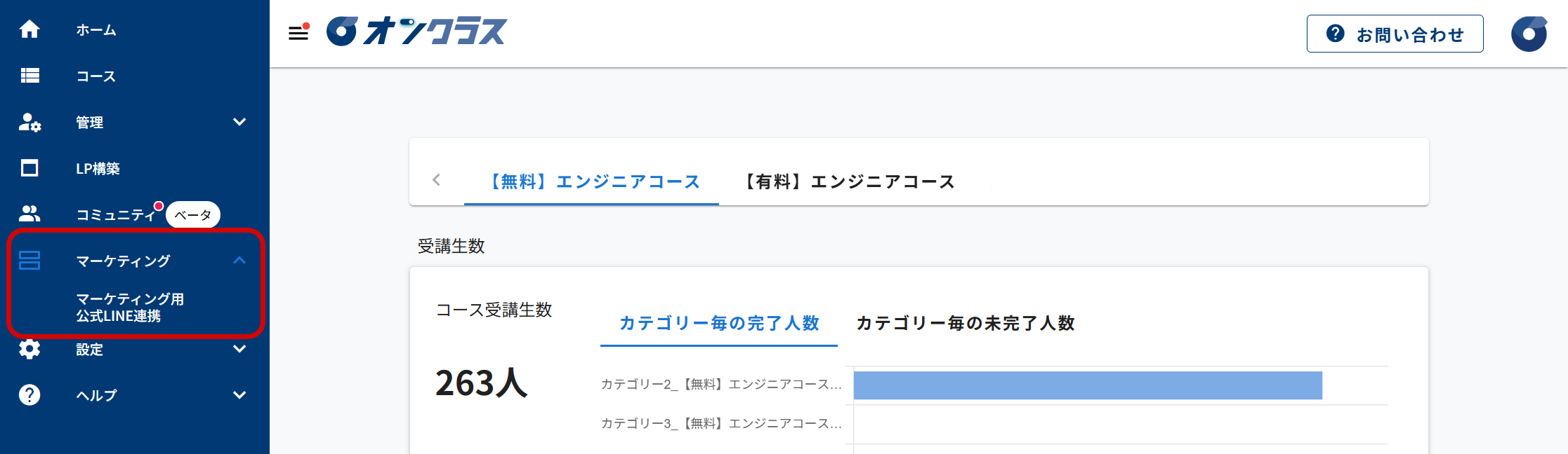 - 左側のメニューから、マーケティング>マーケティング用公式LINE連携の順にクリックし、マーケティング用公式LINE連携のアカウント一覧画面を表示します。