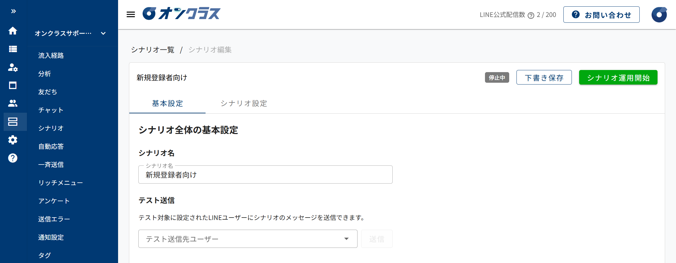 - シナリオ編集画面が表示されます。シナリオ編集画面は「基本設定」タブと「シナリオ設定」タブで構成されています。