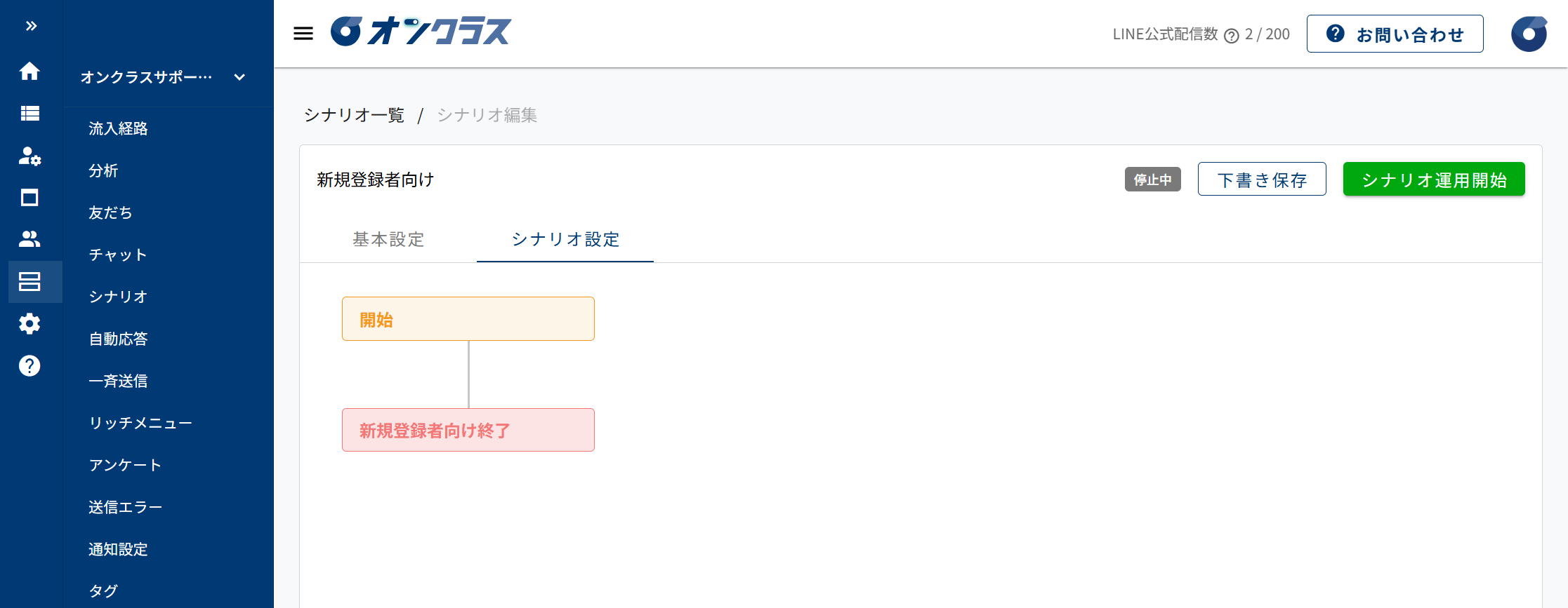 運用中のシナリオを停止する場合は、停止したいシナリオ名をクリックしてシナリオ編集画面を開き、「下書き保存」をクリックします。その後、「ステータス」欄で、「停止中」と表示されていることを確認してください。